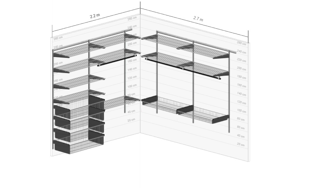 В комплект входят несущие рельсы и навесные направляющие, полки, штанги, аксессуары, крепежные элементы. Можно докупить множество дополнительных компонентов для гардеробной системы.