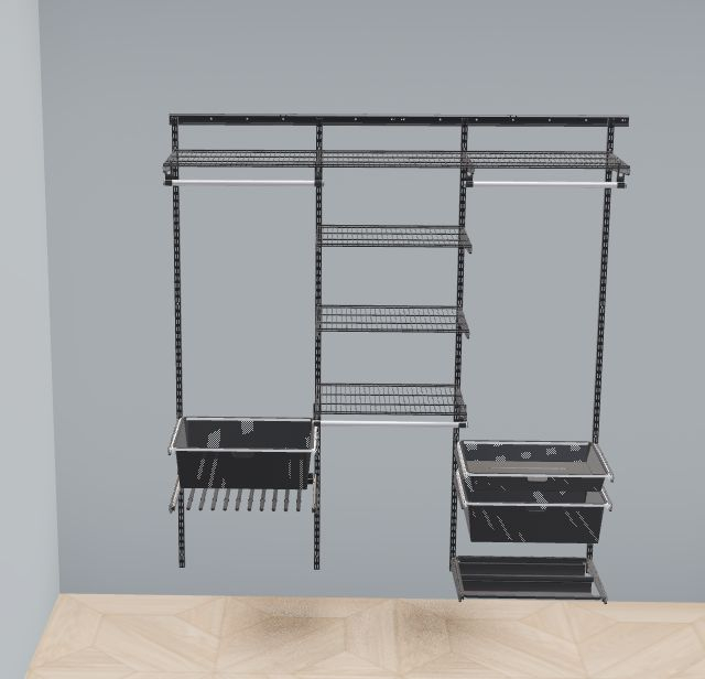 В комплект входят несущие рельсы и навесные направляющие, полки, штанги, аксессуары, крепежные элементы. Можно докупить множество дополнительных компонентов для гардеробной системы.