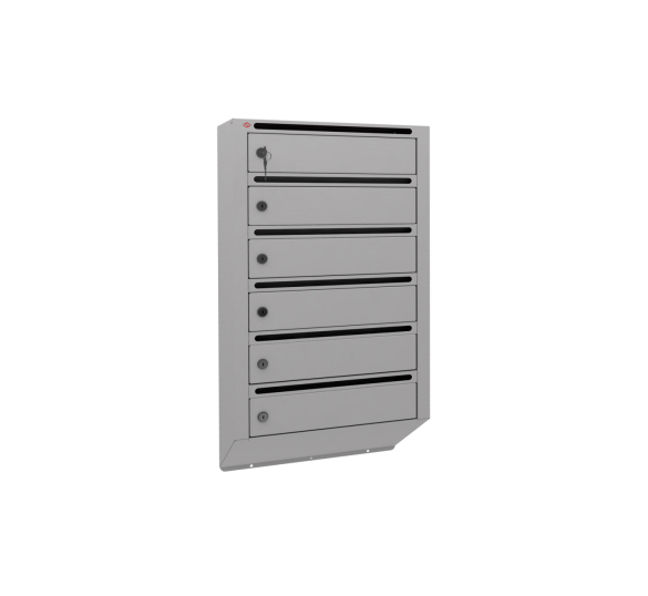 6-х секционный почтовый ящик для подъездов многоквартирных домов серии «Гарант Люкс». Почтовый ящик «Гарант Люкс» имеет усиленную конструкцию корпуса и выполнен из холоднокатанной стали. Дверцы почтового ящика имеют толщину металла 1 мм. Открытие дверок производится слева направо. Конструкция почтового ящика предусматривает возможность перевешивания дверок на противоположную сторону (справа налево). Корреспонденция располагается в секции под углом 50 градусов.