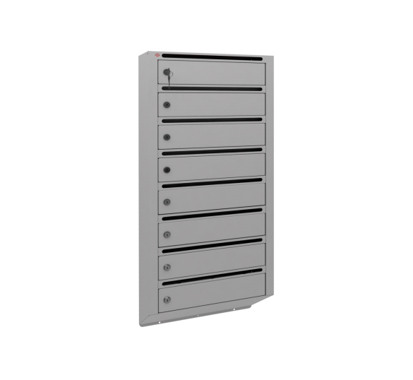 8-и секционный почтовый ящик для подъездов многоквартирных домов серии «Гарант Люкс». Почтовый ящик «Гарант Люкс» имеет усиленную конструкцию корпуса и выполнен из холоднокатанной стали. Дверцы почтового ящика имеют толщину металла 1 мм. Открытие дверок производится слева направо. Конструкция почтового ящика предусматривает возможность перевешивания дверок на противоположную сторону (справа налево). Корреспонденция располагается в секции под углом 50 градусов.