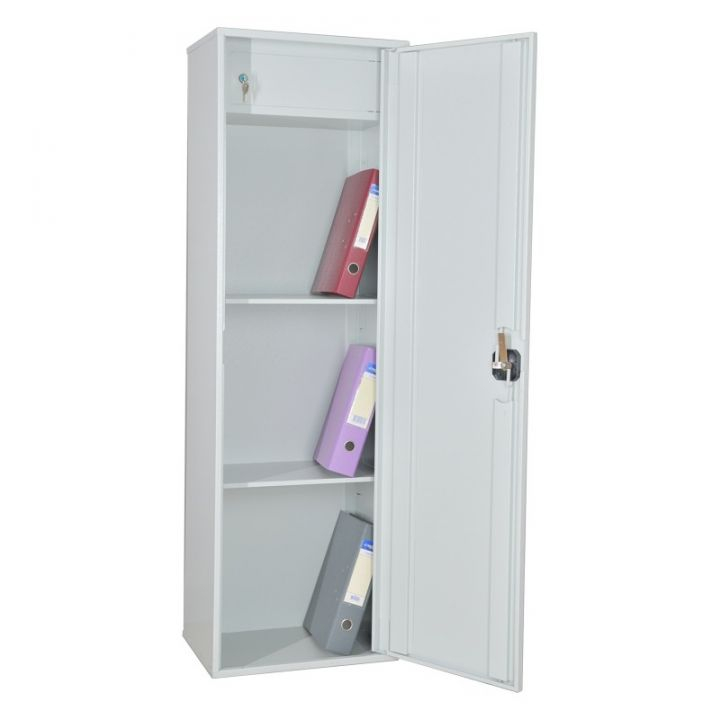 Шкаф офисный односекционный ШМ-180 ТМ предназначен для хранения бумажных документов. Корпус и дверь шкафа толщиной 1 мм. Шкаф для документов металлический офисный ШМ-180 ТМ оснащен четырьмя съемными полками. В двери установлен ключевой почтовый тяговый замок «ЗП-053» г. Москва или аналогичный замок другого производителя. Шкаф изготовлен по новой, уникальной, технологии нашей фирмы на высокоточном оборудовании. Заготовка комплектующих для данного шкафа производится методом лазерной резки, что позволяет добиться высокого качества и эстетичного вида изделия. Скругленные углы дверей повысили безопасность изделия снизив количество травм возникающих при контакте с угловой поверхностью двери. Сварка шкафа производится «от лица», позволяя скрыть все места сварки и перенести их на заднюю стенку изделия, что так же улучшает общее впечатление от изделия.