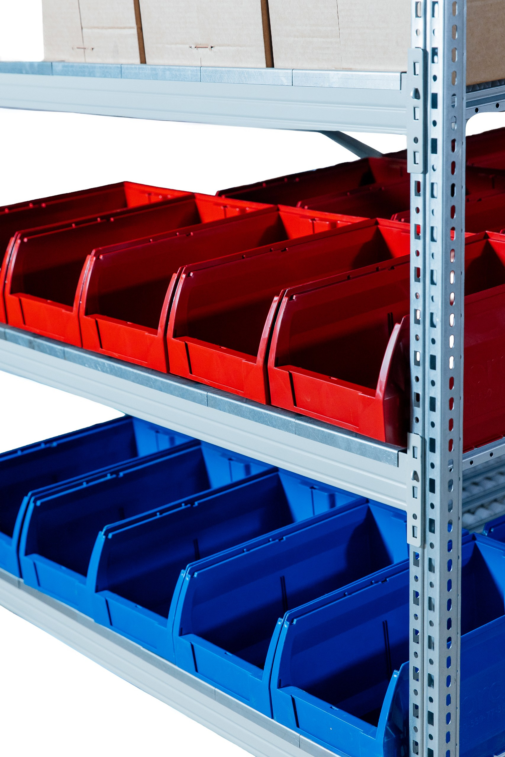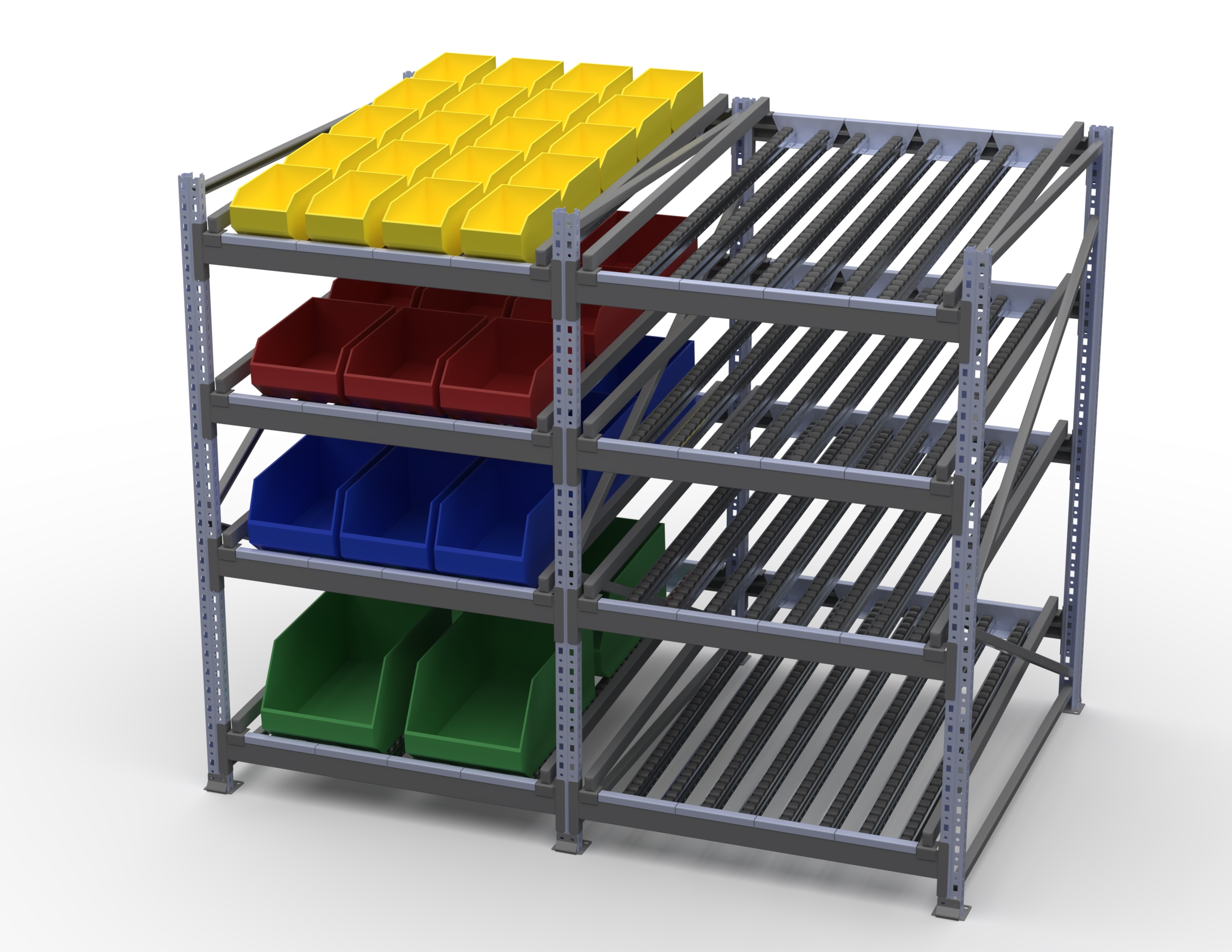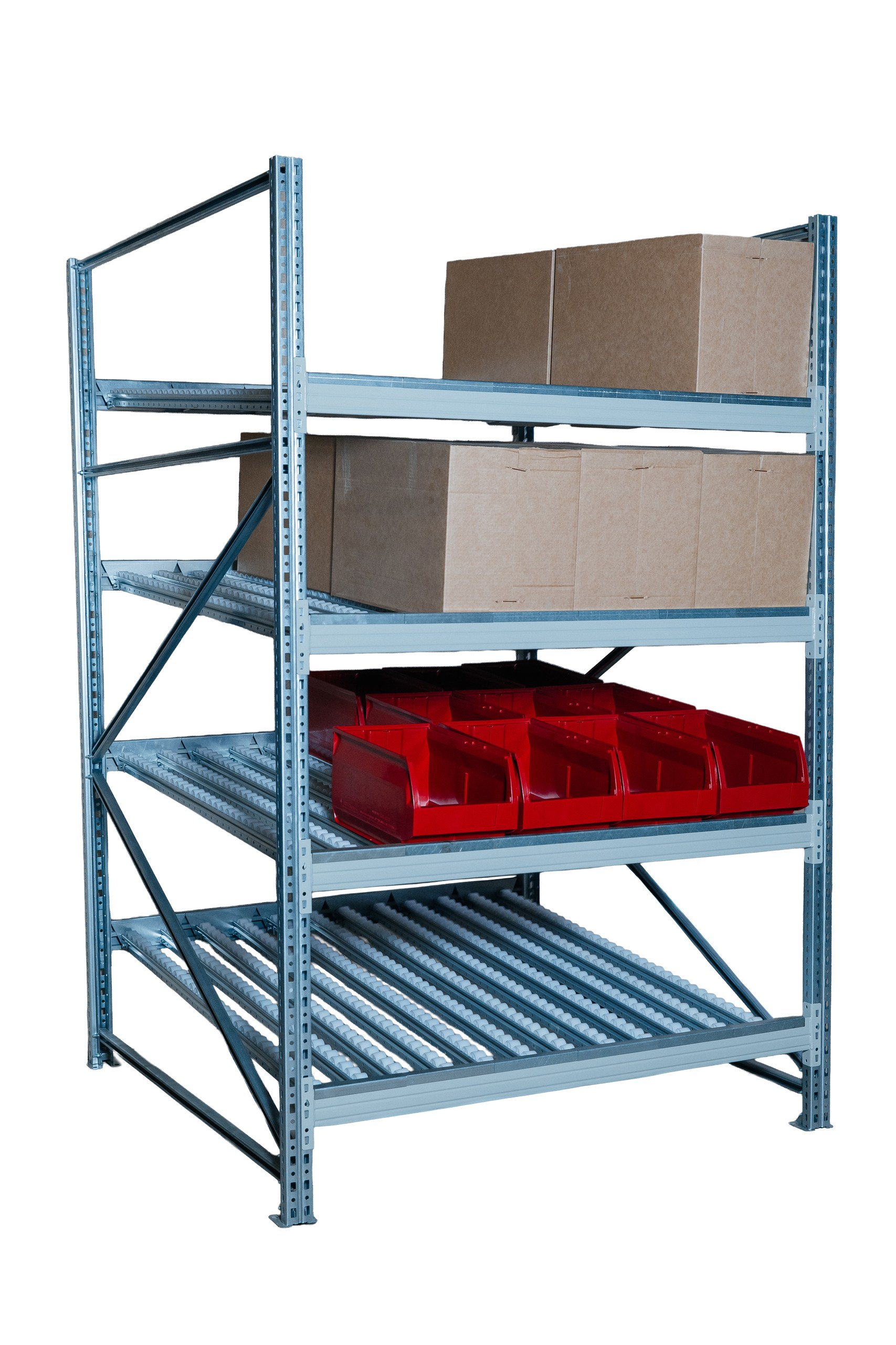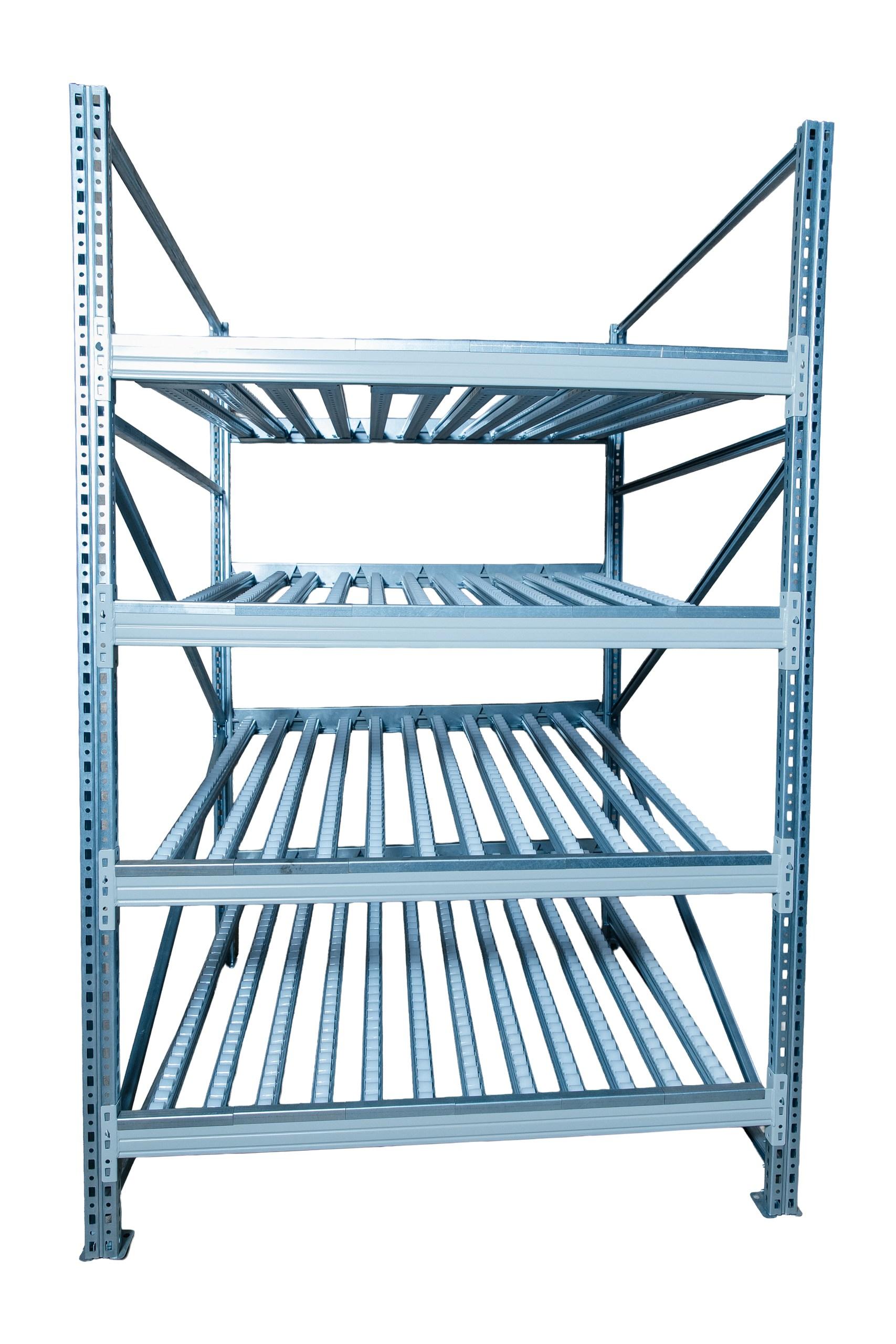 За счёт роликовых дорожек стеллаж помогает поддерживать порядок на складе, улучшает визуальный контроль остатков и делает процесс пополнения более удобным и быстрым.