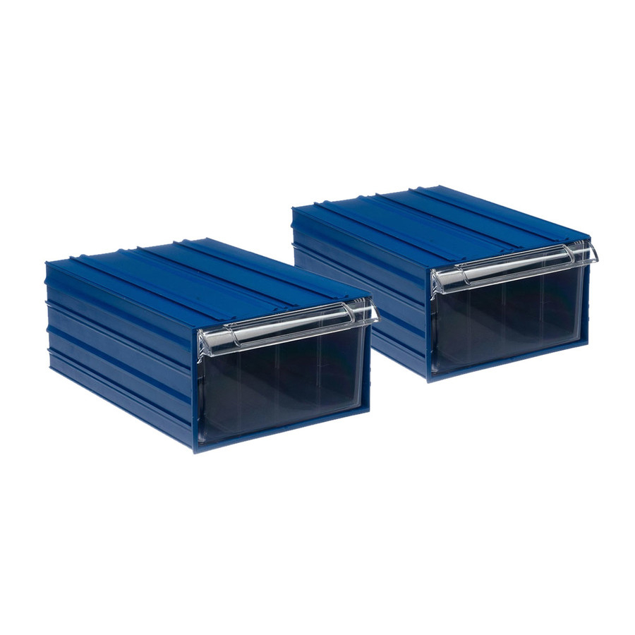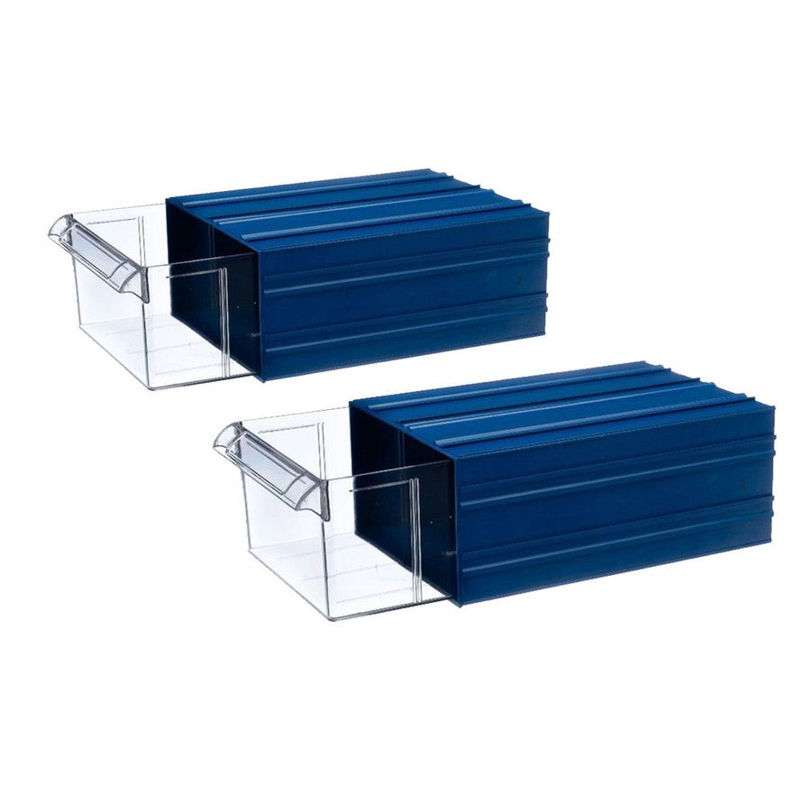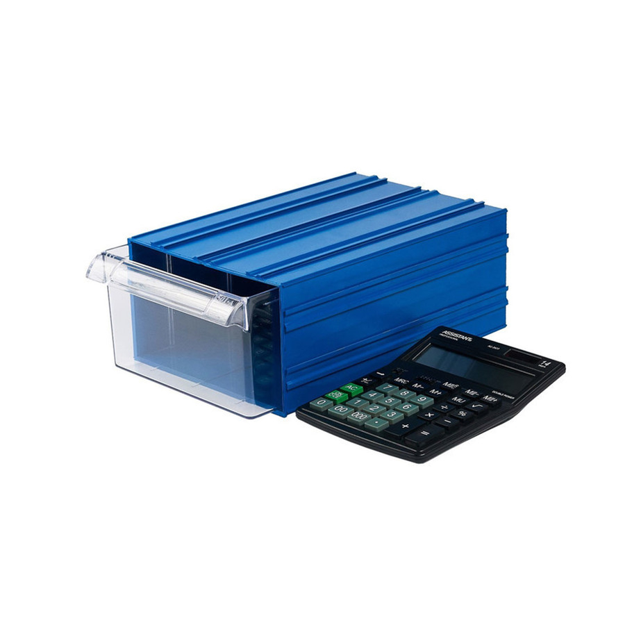 Пластиковый короб С-501-А синий, прозрачный (328х212х126 мм) комплект в упаковке 2 шт. предназначен для хранения мелкоштучных изделий и комплектующих. Пластиковые короба С-501-А с выдвижными ящиками изготовлены из полистирола. Длина самого короба составляет 304 мм + 24 мм выступ ручки короба. Полезные габариты внутреннего короба 295х195х110 мм.