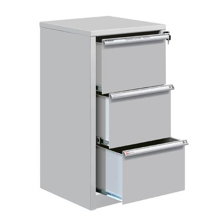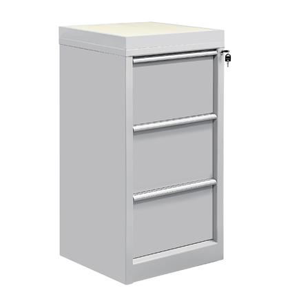 Каркас и ящики стационарной тумбы изготовлены из листового металла толщиной 1 мм, покрытого износостойкой порошковой краской светло-серого цвета RAL7035 с высокой стойкостью к химическим, термическим и механическим нагрузкам. Три выдвижных ящика на телескопических направляющих.