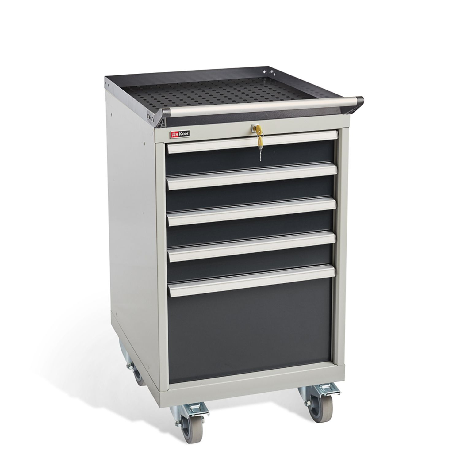 Тумбы окрашены эпоксидной порошковой краской, устойчивой к механическим воздействиям и агрессивным жидкостям: корпус и экран – серые RAL 7038; ящики и двери – антрацитовый серый RAL 7016.