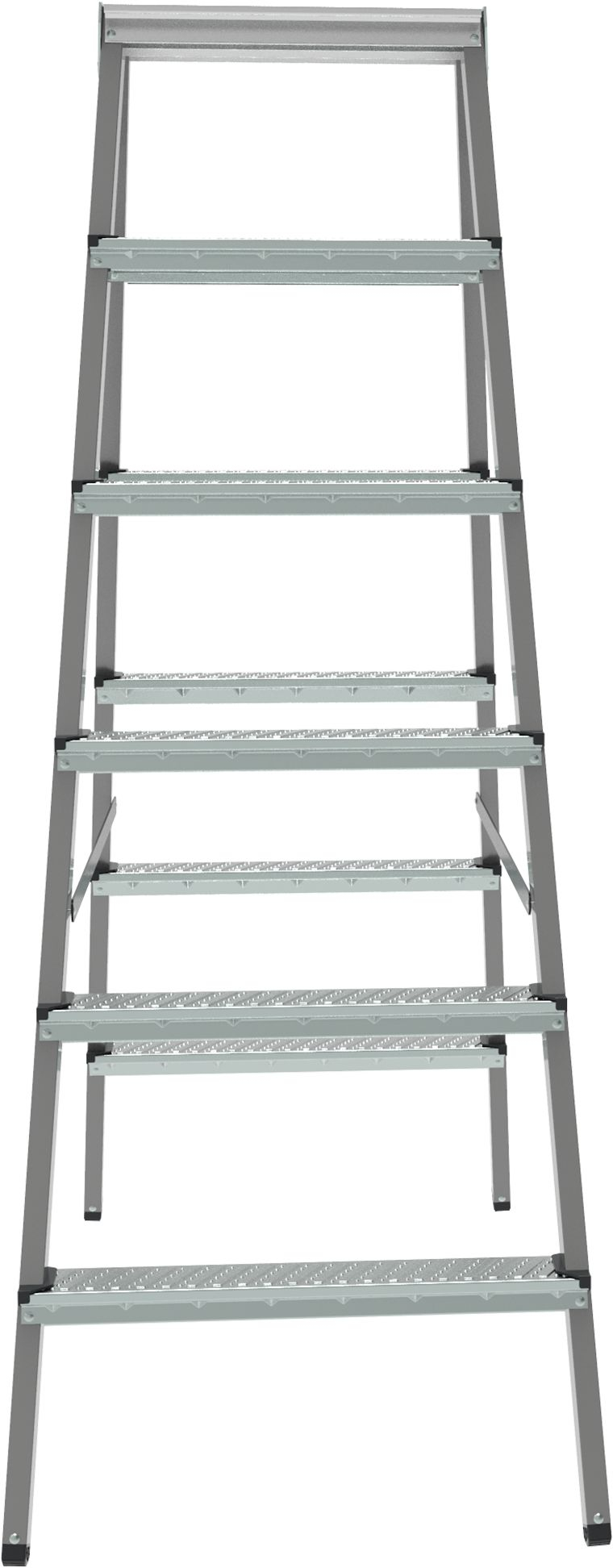 - Стальные оцинкованные рифлёные ступени 70 мм с дополнительными рёбрами жёсткости для надёжного сцепления.