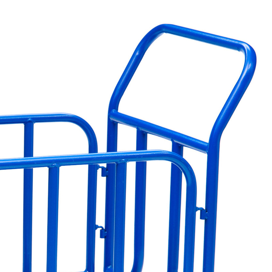 Платформенная 4-х колесная тележка с трубчатыми бортами КПО-300Т используется для транспортировки различных сборных грузов на оптовых базах и складах. Размер платформы 600х1000мм., Металлический борт груз от падения и ударов, что позволяет перевозить хрупкие предметы и сборные грузы. Ручки и борта тележки снимается для удобства транспортировки и компактного хранения. Высота боковых сетчатых бортов 400мм, высота борта от платформы 480мм., высота ручки 750мм., каркас платформы труба диаметром 28мм., настил металлический лист толщиной 1,2мм., ручка труба диаметром 28мм., толщина 1,5мм. каркас борта труба диаметром 25мм., толщина 1,5мм. Платформа имеет уникальную рельефную противоскользящую поверхность. Покрытие полимерное. Цвет синий, шагрень. Для легкого перемещения тележка КПО-300Т комплектуется 2 поворотными и 2 неповоротными колесами, изготовленными из высококачественной литой резины.