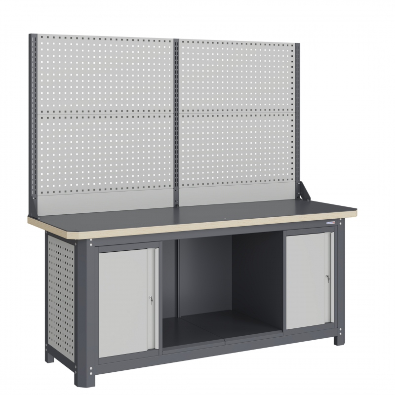 Верстак серии MECHANIC: MCN 2052.S77.11-2 состоит из столешницы шириной 1993 мм, рамы верстака, состоящей из опор, перемычек, боковых перфопанелей, двух малых модулей S7 и двух комплектов полка-стенка SW1, двойного экрана с кронштейнами.