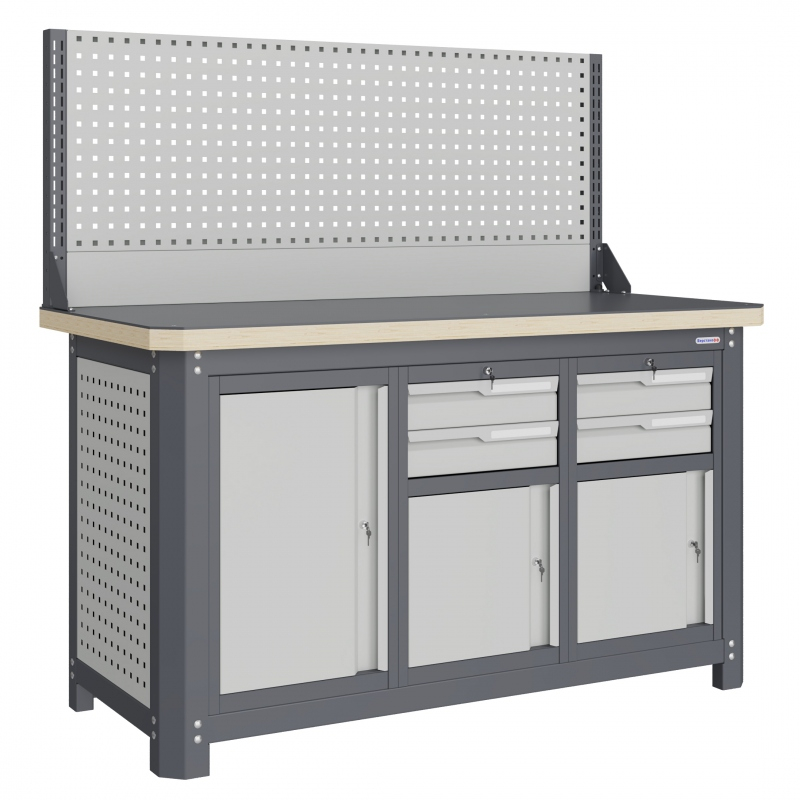Верстак серии MECHANIC: MCN 1552.S799-1 состоит из столешницы шириной 1493 мм, рамы верстака, состоящей из опор, перемычек, боковых перфопанелей, малых модулей S7 и S9, одинарного экрана с кронштейнами.