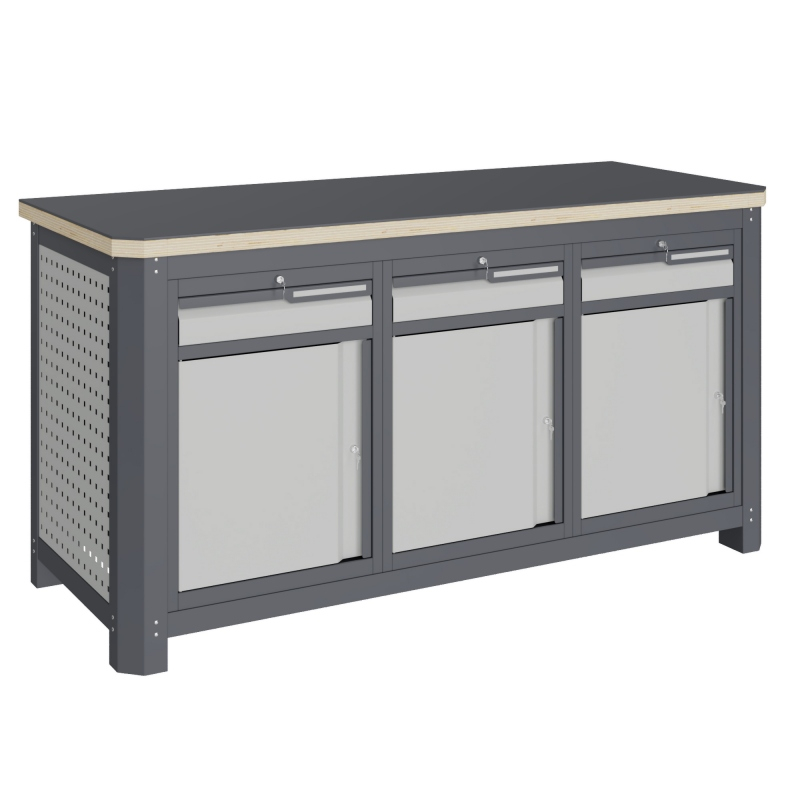 Верстак серии MECHANIC: MCN 1552.S888 состоит из столешницы шириной 1493 мм, рамы верстака, состоящей из опор, перемычек, боковых перфопанелей, четырех малых модулей S8.