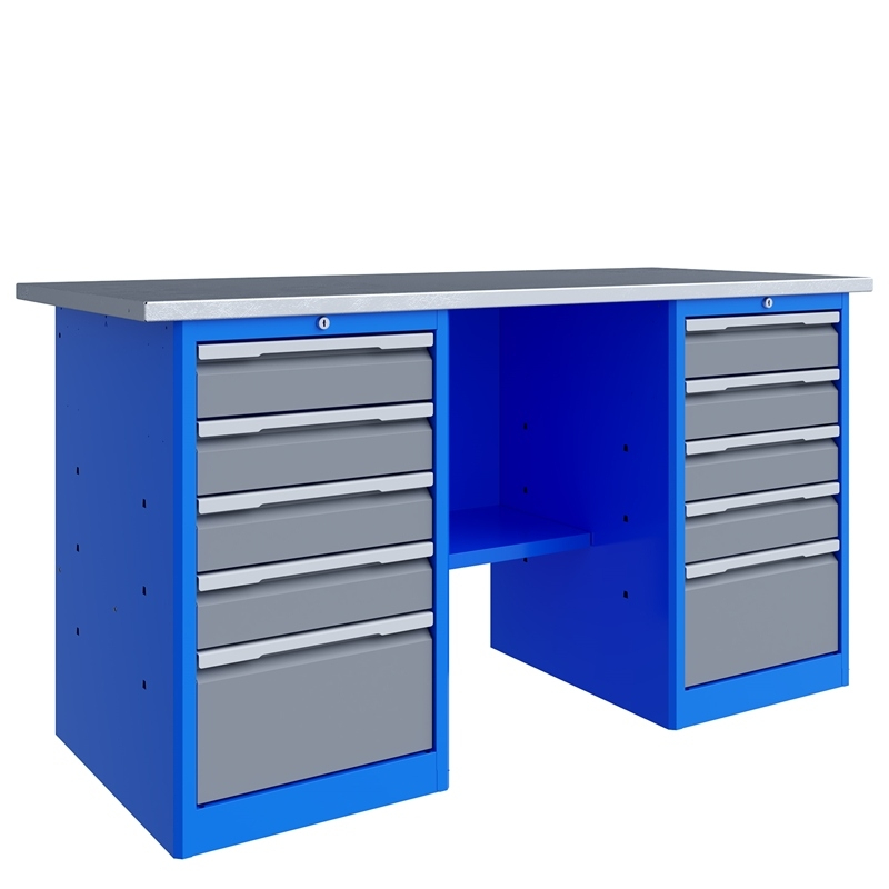 Тумбы верстаков выполнены сварными. Ящики в тумбах устанавливаются на шариковых телескопических направляющих полного выдвижения. В тумбах P5 установлено четыре малых и один большой ящик. Внутренние размеры малых ящиков (ВхШхГ), не более: 103 х 397 х 520 мм. Внутренние размеры больших ящиков (ВхШхГ), не более: 222 х 397 х 520 мм. Тумбы с ящиками снабжены общим центральным замком с поворотом ригеля 180 градусов и подпружиненной тягой. В комплекте два ключа с каждой тумбой.