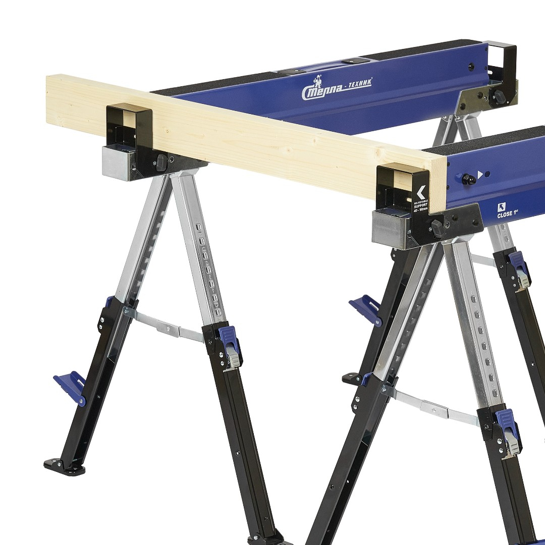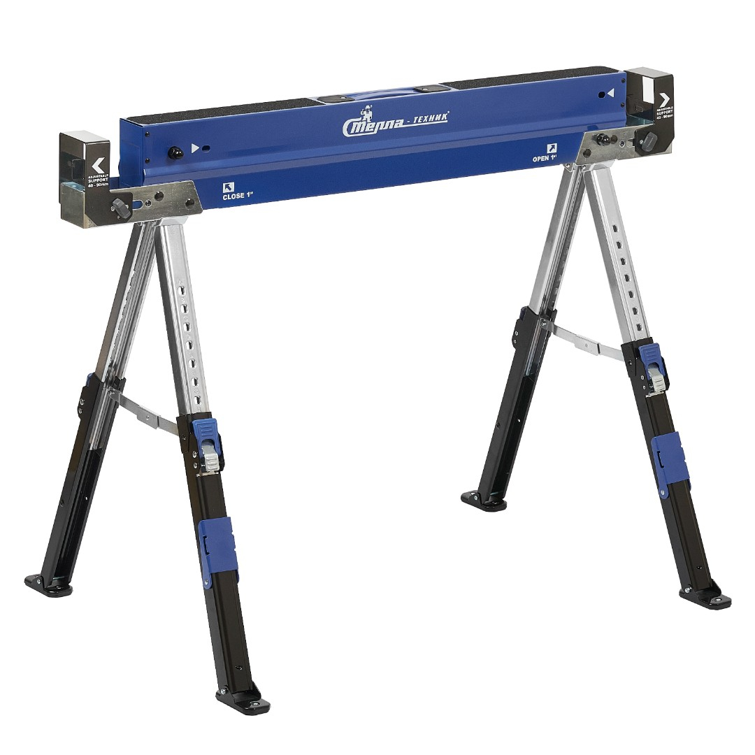 Козлы изготовлены из качественной стали с порошковым окрасом, для предотвращения коррозии, и выдерживают жесткие условия эксплуатации. Оборудованы складными, телескопическими ножками и регулируются по высоте в 8-ми положениях: от 620 до 820 мм.