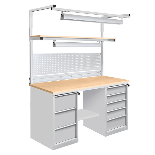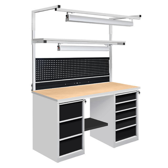 На тумбах установлен центральный замок для индивидуального доступа. Ручки изготовлены из алюминиевого профиля с анодированным покрытием и боковыми пазами, для установки обозначения (маркировки) ящиков по их прямому назначению (подразделение организации, документация, инструменты, материалы и т.д.). В зависимости от габаритов используемых инструментов, материалов и оснастки возможно подобрать тумбу верстака с разным количеством ящиков. Нижняя полка верстака изготовлена из металла для устойчивого положения верстака и позволяет организовать хранение материалов.