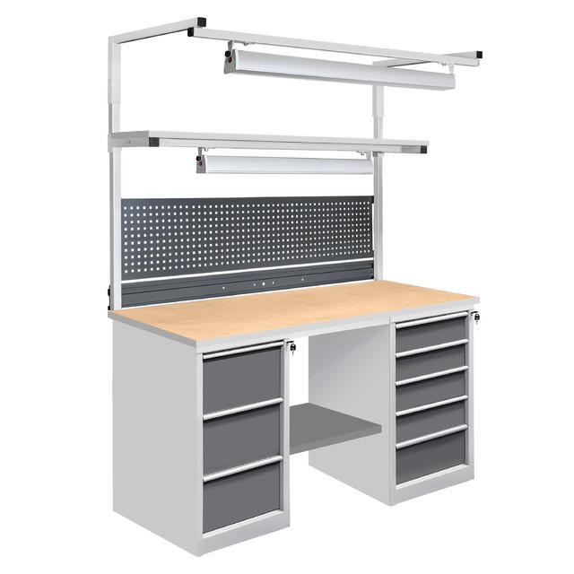 Верстак слесарный это стол для слесарных и столярных работ за которым с помощью инструмента производиться ручная обработка изделий из дерева, металла и других материалов. Верстак имеет устойчивую конструкцию, в качестве опор выступают тумбы металлические ТС-3 и ТС-5, которые могут быть установлены с левой и с правой стороны. Конструкция слесарного верстака с применением дополнительного оборудования позволяет разместить необходимый инструмент, оснастку, материалы и документацию для организации рабочего процесса.