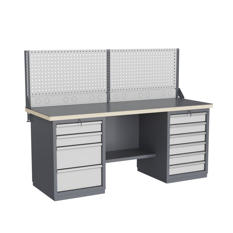 Тумбы и опоры верстаков выполнены из профилированной холоднокатаной стали и имеют сварную конструкцию. Возможна установка любых сочетаний тумб с различным количеством выдвижных ящиков, а также с дверцей и полками. Между тумбами и опорами возможна установка полки-стенки. На каждой ручке ящика и двери закреплен специальный алюминиевый профиль с отделением для установки маркировки. На тумбы с выдвижными ящиками установлена система антиопрокидывания, которая ограничивает выдвижение остальных ящиков тумбы, если один из ящиков выдвинут. Ящики снабжены специальными усиленными шариковыми направляющими. Тумбы снабжены центральной системой запирания.