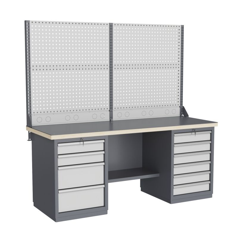 Верстак может комплектоваться одинарным или двойным перфорированным экраном, электромонтажным блоком для установки розеток и дополнительных устройств, а также комплектом освещения с держателем и лампой. Перфорация экрана подходит под стандартные держатели для инструментов, отверток, крючков, полок. Возможна комплектование верстака навесным элементами (держатели, крючки, полки).