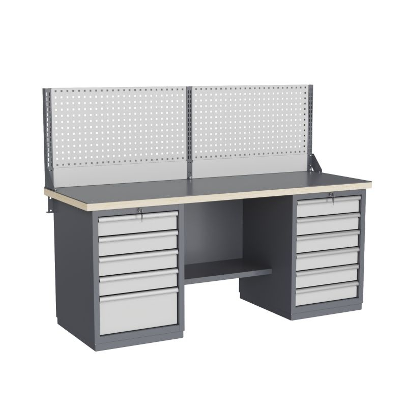 Тумбы и опоры верстаков выполнены из профилированной холоднокатаной стали и имеют сварную конструкцию. Возможна установка любых сочетаний тумб с различным количеством выдвижных ящиков, а также с дверцей и полками. Между тумбами и опорами возможна установка полки-стенки. На каждой ручке ящика и двери закреплен специальный алюминиевый профиль с отделением для установки маркировки. На тумбы с выдвижными ящиками установлена система антиопрокидывания, которая ограничивает выдвижение остальных ящиков тумбы, если один из ящиков выдвинут. Ящики снабжены специальными усиленными шариковыми направляющими. Тумбы снабжены центральной системой запирания.